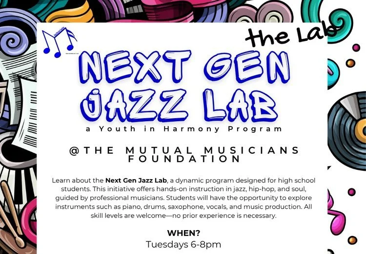 Next Gen Jazz Lab is a free summer music program for youth ages 14–18, hosted at the historic Mutual Musicians Foundation. Designed to cultivate real-world musicianship, students receive hands-on instruction in jazz, hip-hop, and soul from professional musicians and educators. Students explore a range of instruments—piano, drums, saxophone, vocals, and music production—within a supportive, collaborative environment. No prior experience is required—all skill levels are welcome to join in building confidence, creativity, and community.